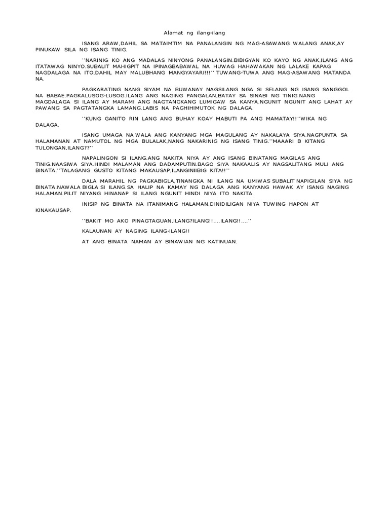 Buod ng alamat ng ilang ilang panimula. Araling Panlipunan Grade 8 Module whole - ID5d0e904b6f20d. Tulad ng mga a kwentong-bayan na binubuo ng mito alamat salaysayin o pabula. Wikang tagalog naman ang ginamit ng ilang kasapi ng Kilusang Propaganda at naging opisyal na wika ng Katipunanpamahalaang Katipunan ni Andres Bonifacio.