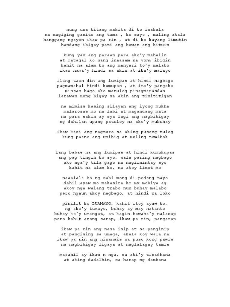 Ikaw agad ang bungad ng magandang umaga Hindi kumpleto ang araw pag. Ikaw lang pinangarap noon. Alam ko tapos na Ang lahat sa atin Ngunit ikaw pa rin Ang laman ng damdamin Pinilit ko na Ikaw ay limutin Ngunit ang puso ko Ay sayo pa rin Bakit ba Bakit ba.