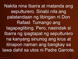 Para siyang tatakasan ng sariling bait at pag-iisip kung paanong maililigtas niya sina Basilio at Crispin sa kamay ng mga sibil. Hindi niya mahanap ang mga bata ngunit napansin niya ang isang pilas ng damit ni Basilio na may bahid ng dugo. I dont claim this one as mine so dont think that I plagiarize it.