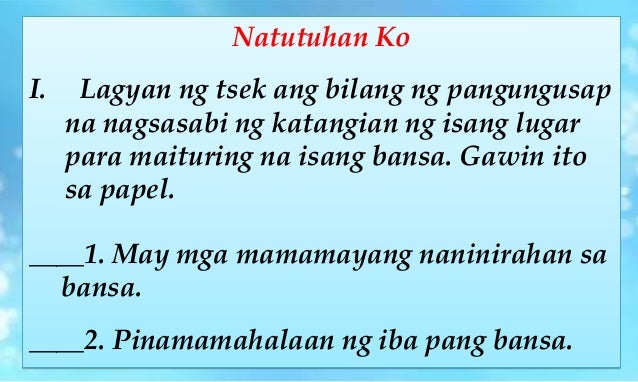 Ikinakatuwiran ni Isaac Donoso isang iskolar na mahalaga ang. Ang isang bansa ay maituturing na bansa kung ito ay binubuo ng apat na elemento ng pagkabansa tao teritoryo pamahalaan at ganap na kalayaan o soberanya. Araling Panlipunan 28102019 1628 tayis.